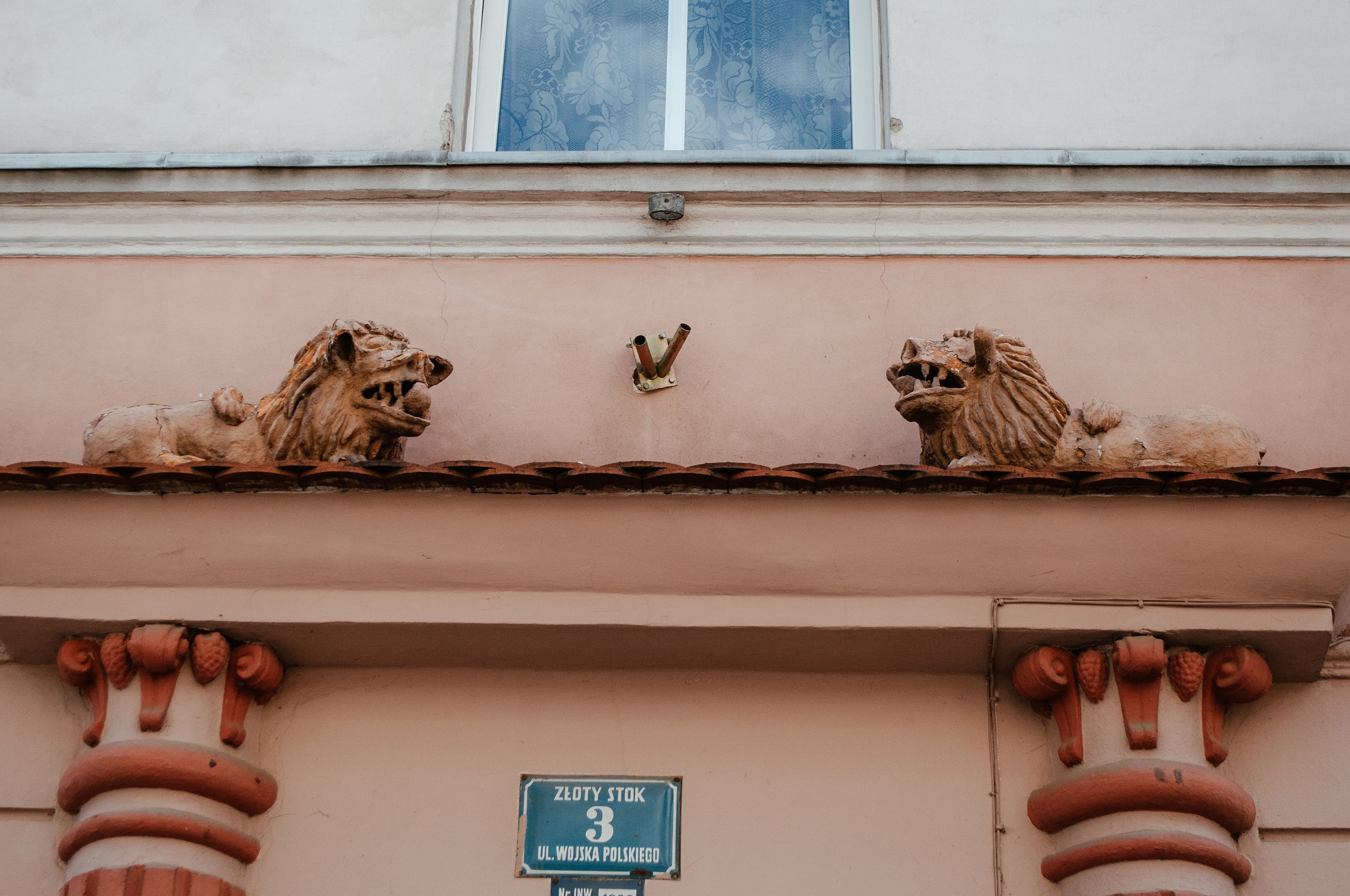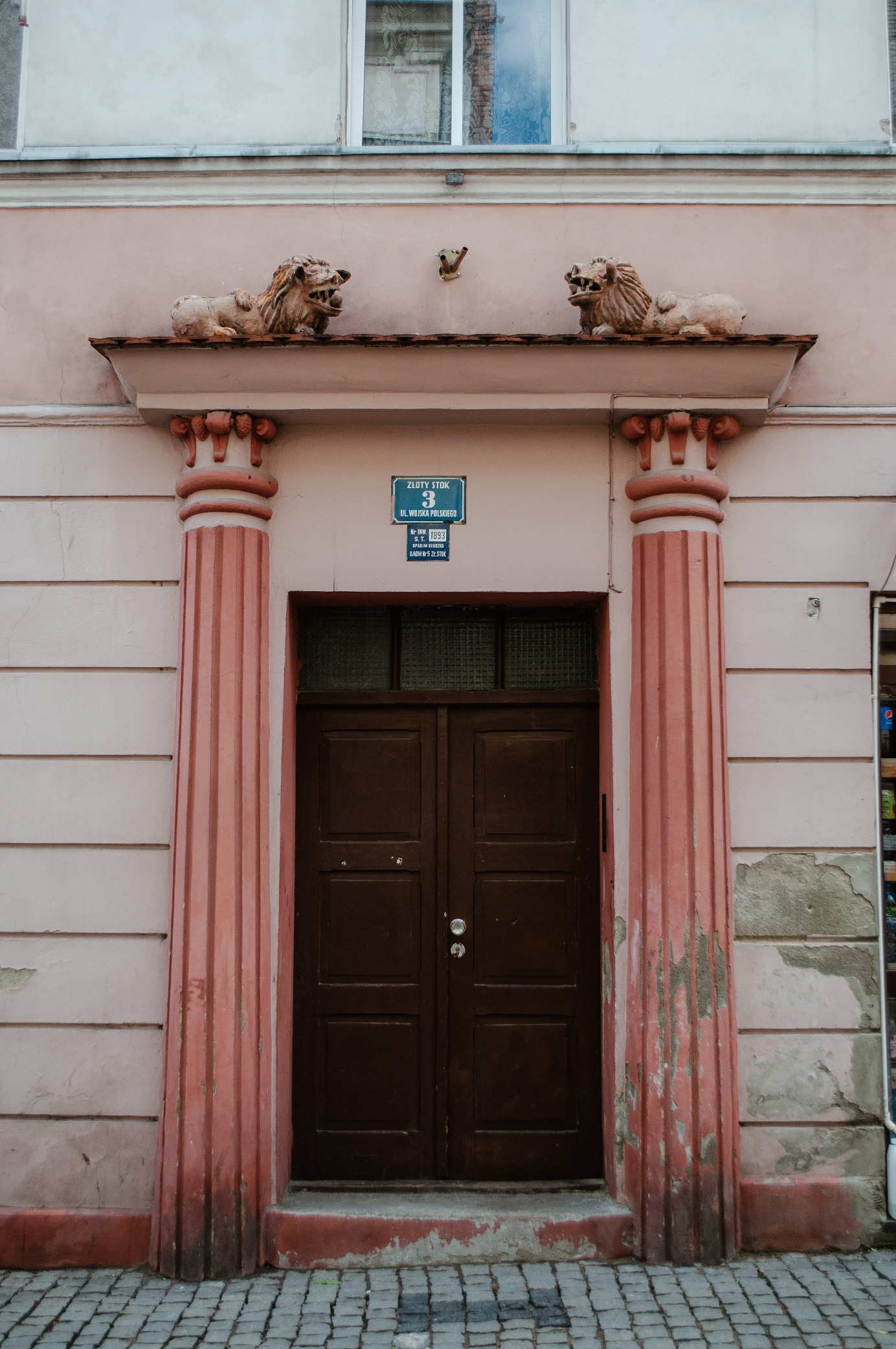 boniowaniem i portalem z dwoma lwami. Po lewej stronie budynek w stylu